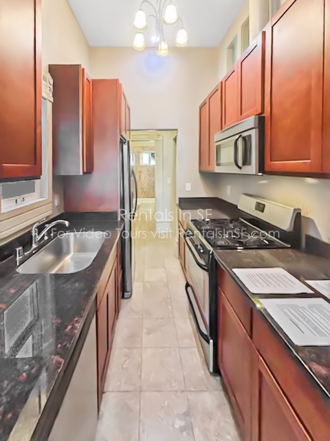 One large bedroom, and living room that is open to a galley kitchen. Stainless appliances: gas stove, dishwasher, microwave and refrigerator and granite counters with pretty wood cabinets. One updated full bath.
