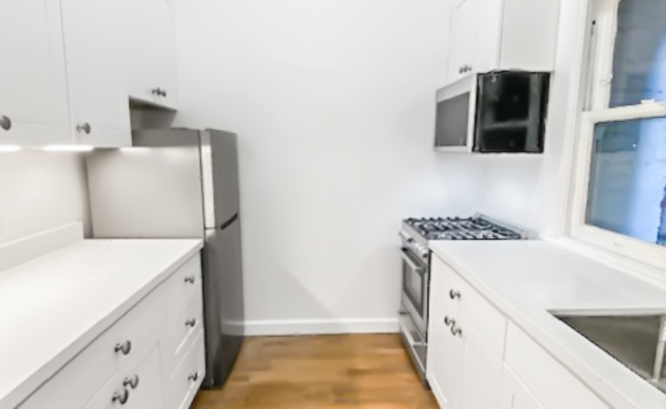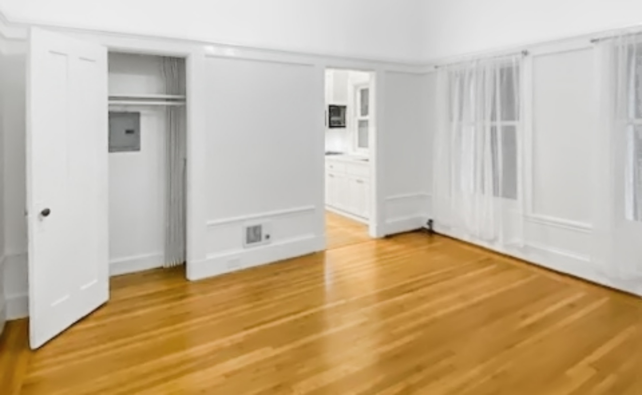 This is a great studio apartment with an updated kitchen with beautiful marble counter tops with a fridge, microwave and gas range. The main room has a coat closet and a lovely built in set of shelves/drawers with original stained glass inserts. There is a lovely full bathroom past the large walk through closet. Hardwood floors in the main room and tile floors in the kitchen & bathroom. Located in the back of the building away from the street.