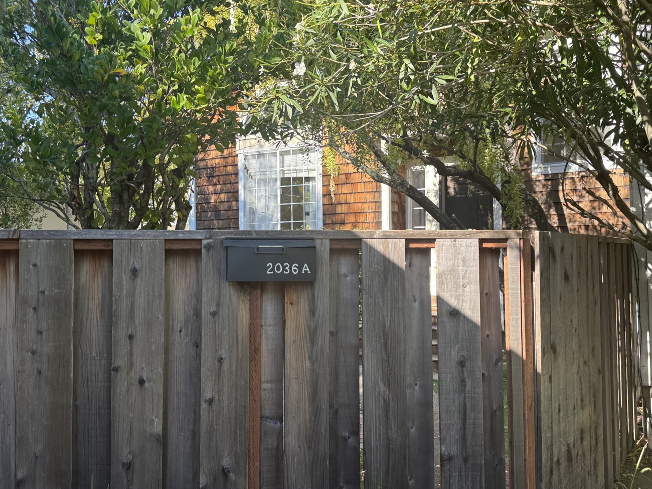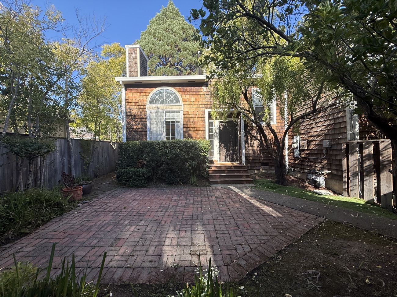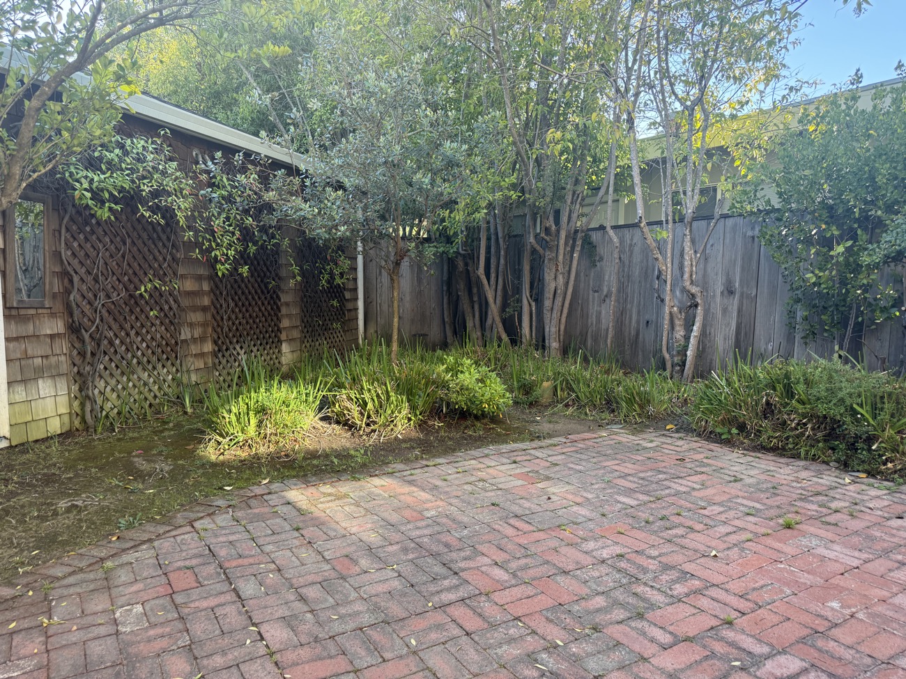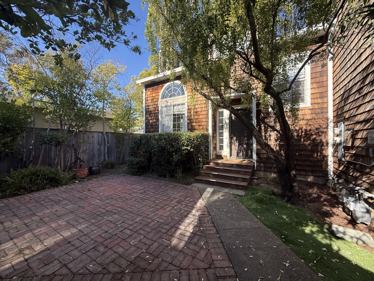 One of the bedrooms features an en suite bathroom. The stairway up top has a skylight, creating natural light. Out front, a private courtyard with a garden and patio offers a sweet little oasis, while the shared carport provides space for two cars (tandem)