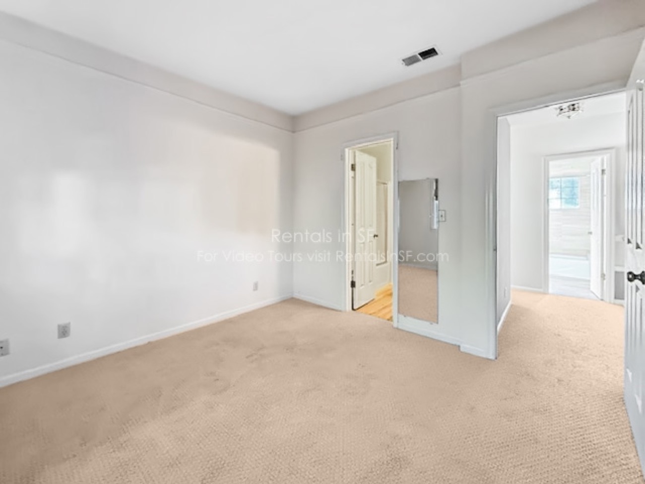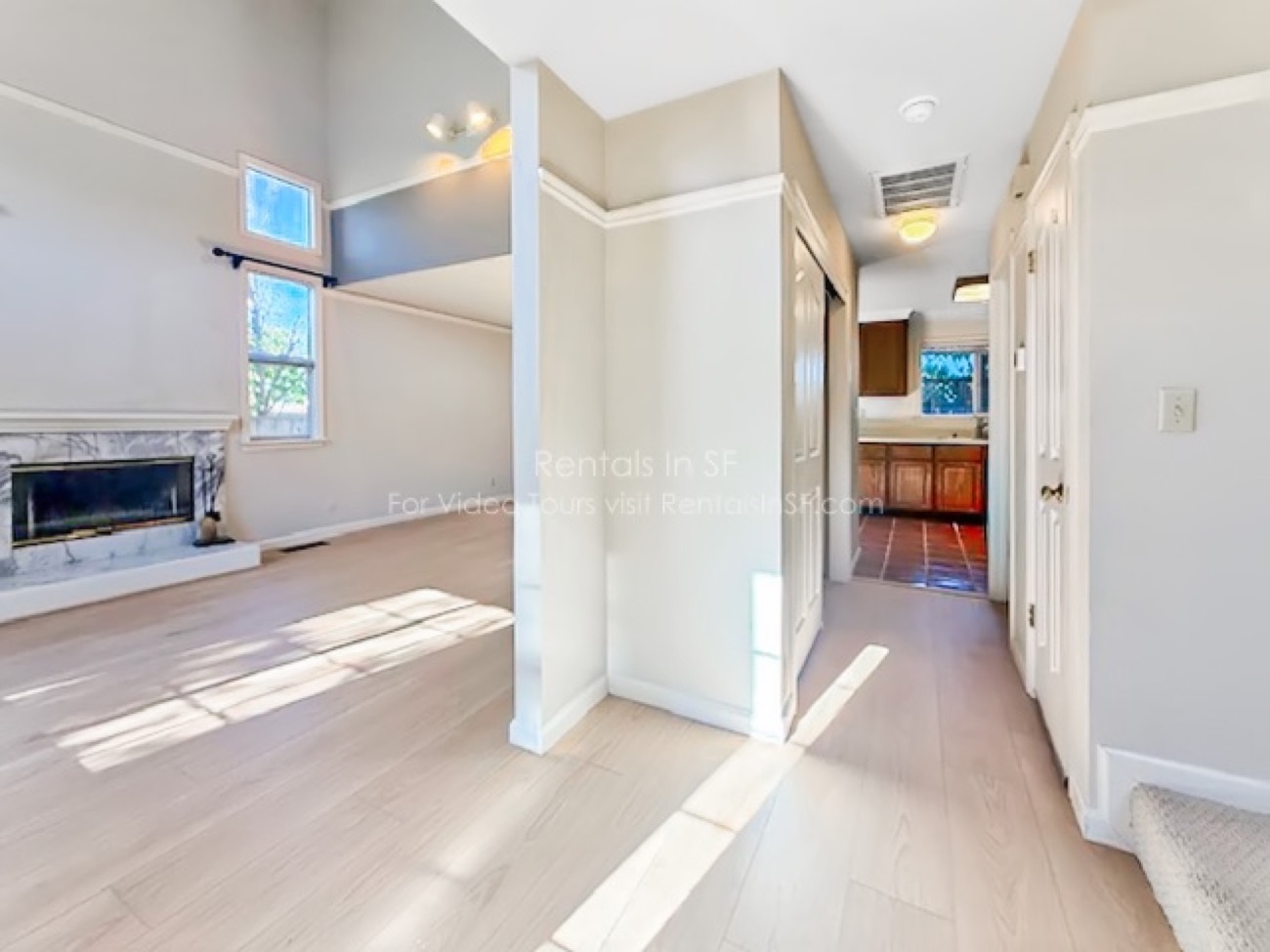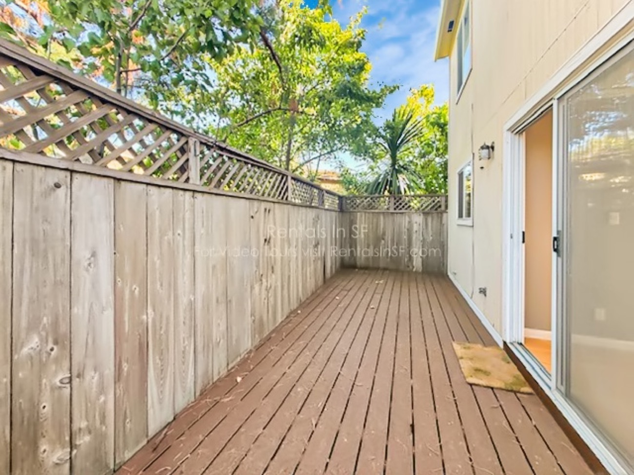 One of the bedrooms features an en suite bathroom. The stairway up top has a skylight, creating natural light. Out front, a private courtyard with a garden and patio offers a sweet little oasis, while the shared carport provides space for two cars (tandem)