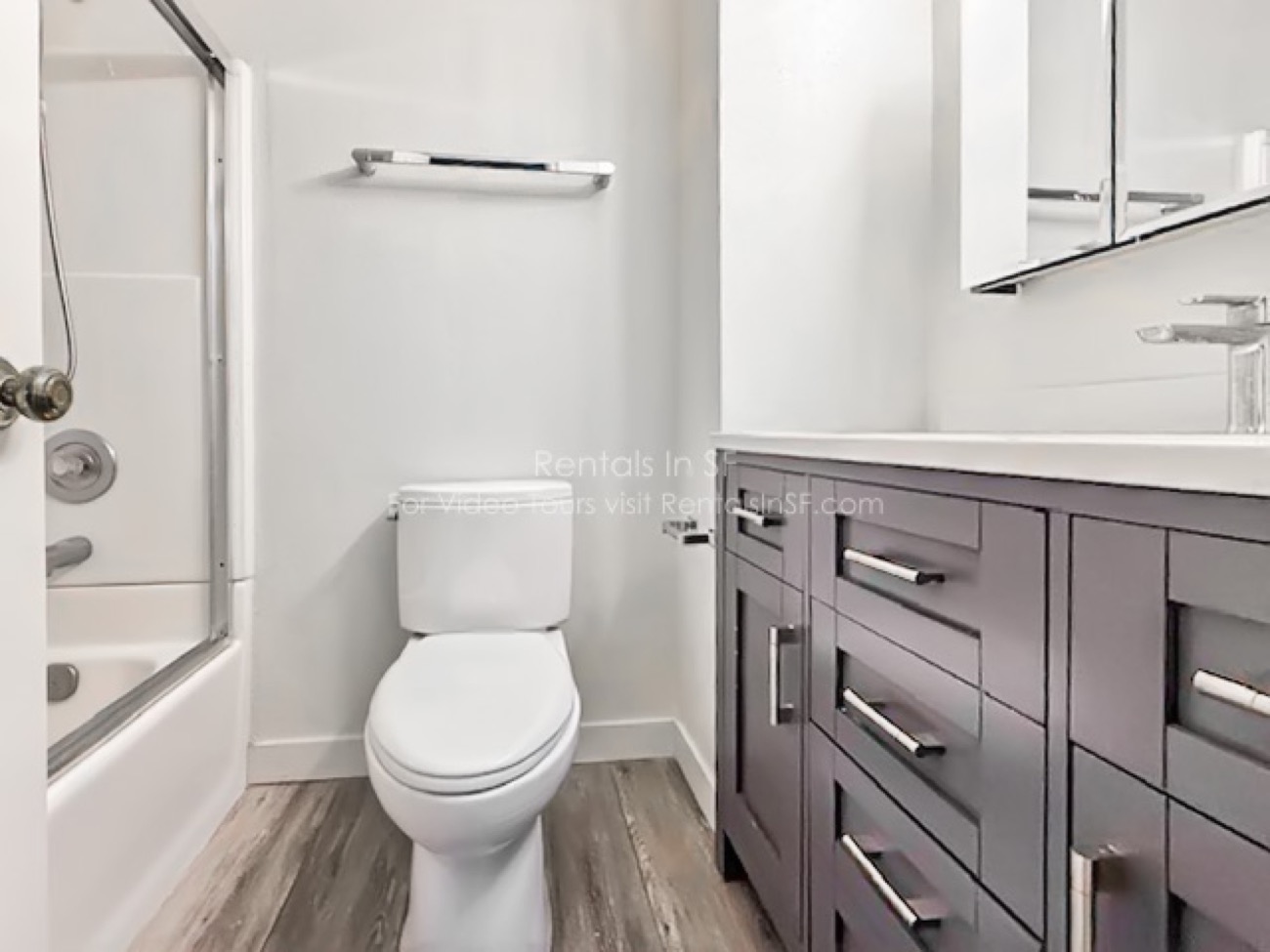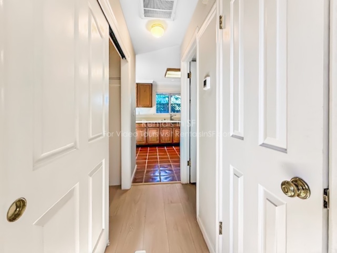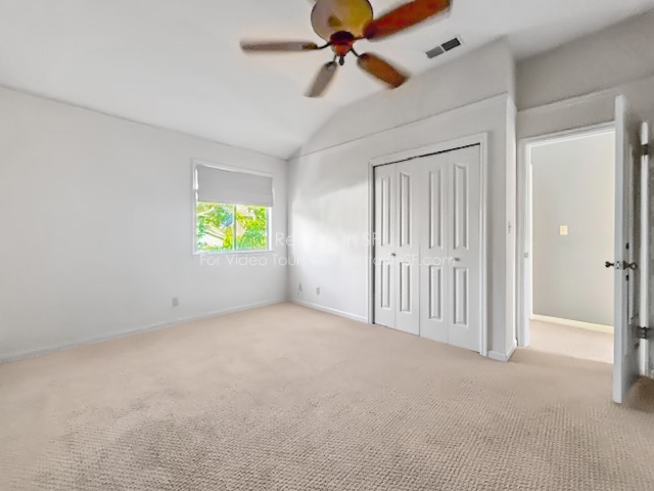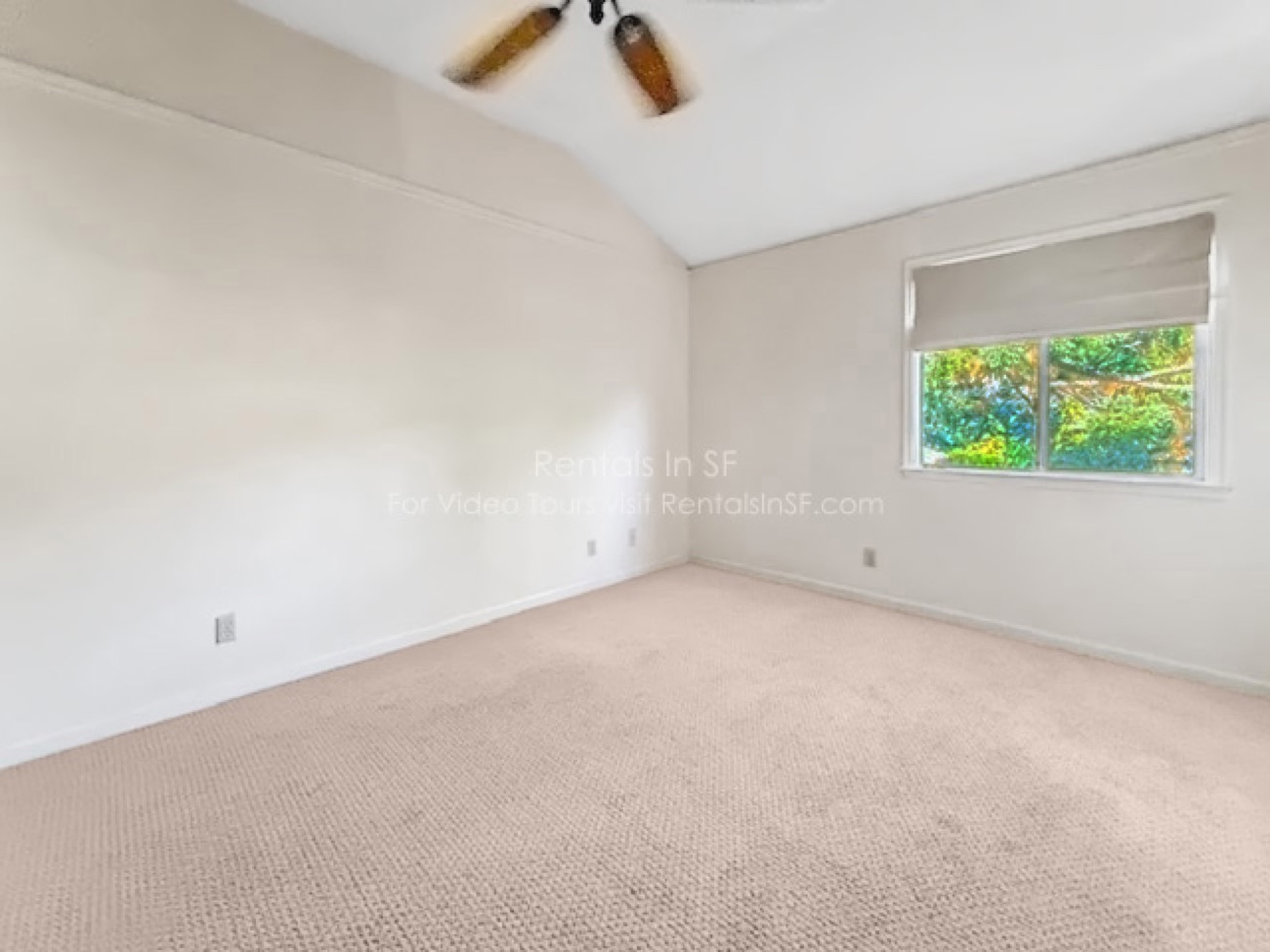 One of the bedrooms features an en suite bathroom. The stairway up top has a skylight, creating natural light. Out front, a private courtyard with a garden and patio offers a sweet little oasis, while the shared carport provides space for two cars (tandem)