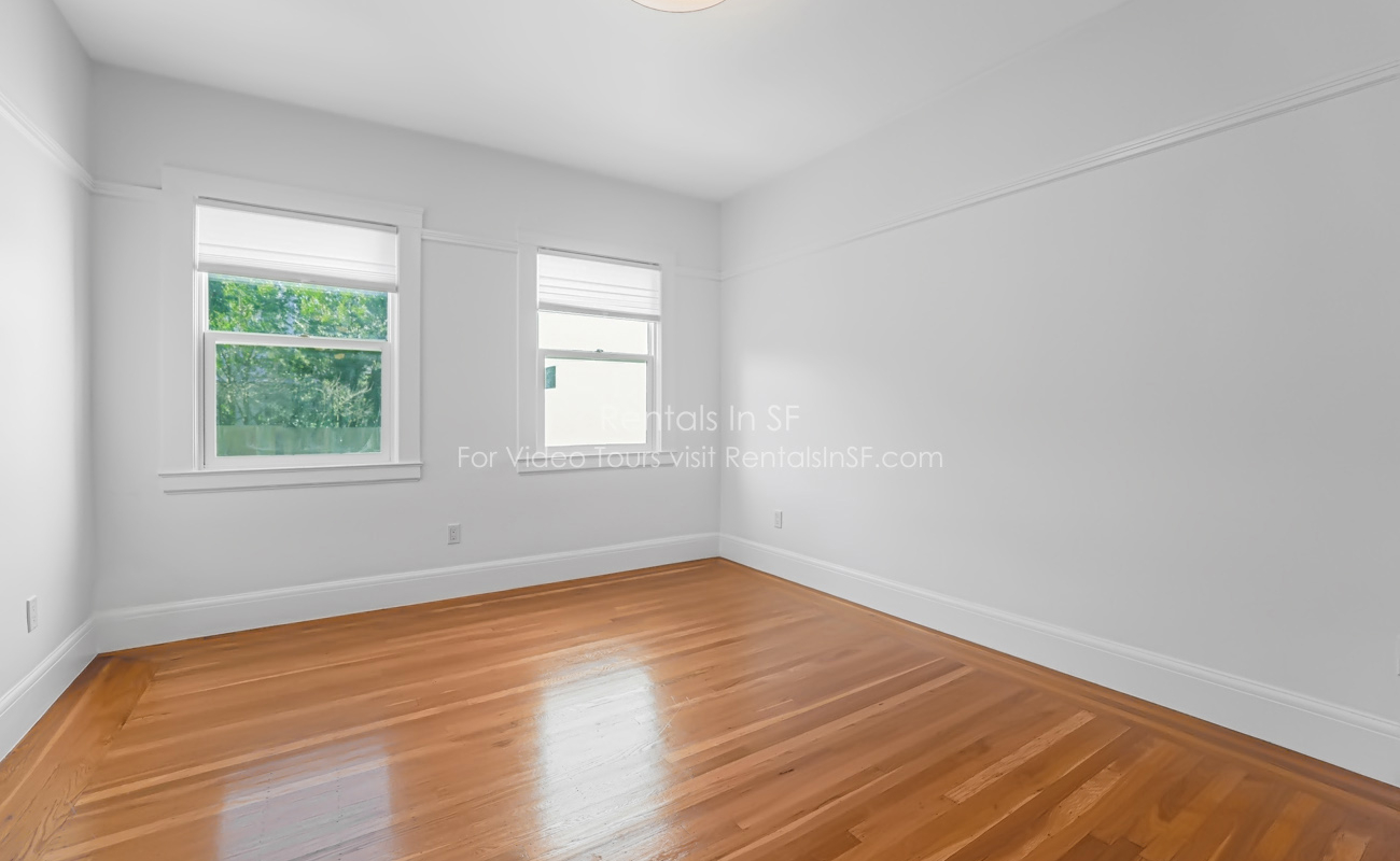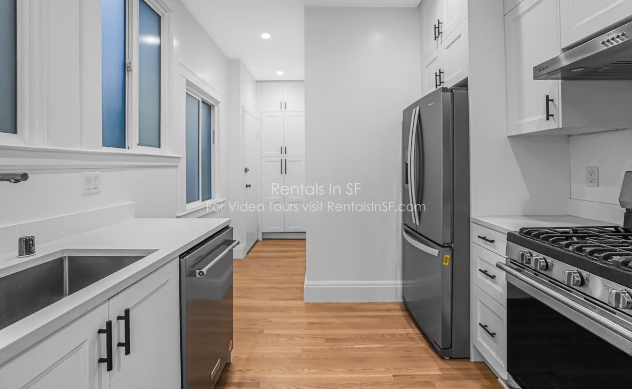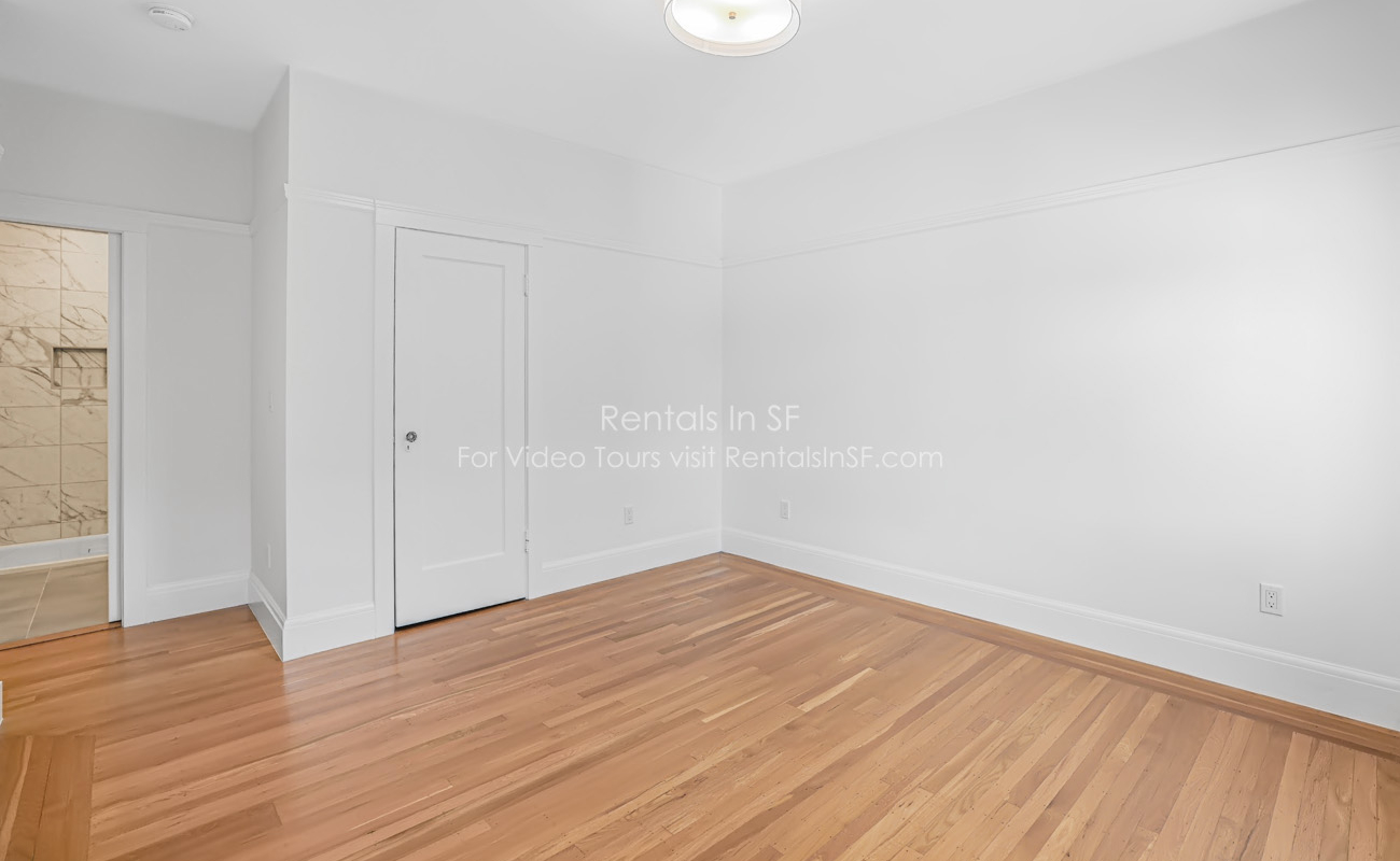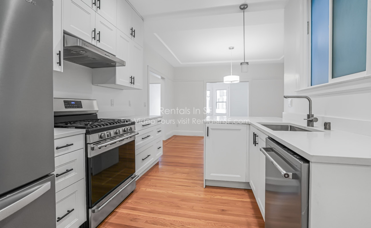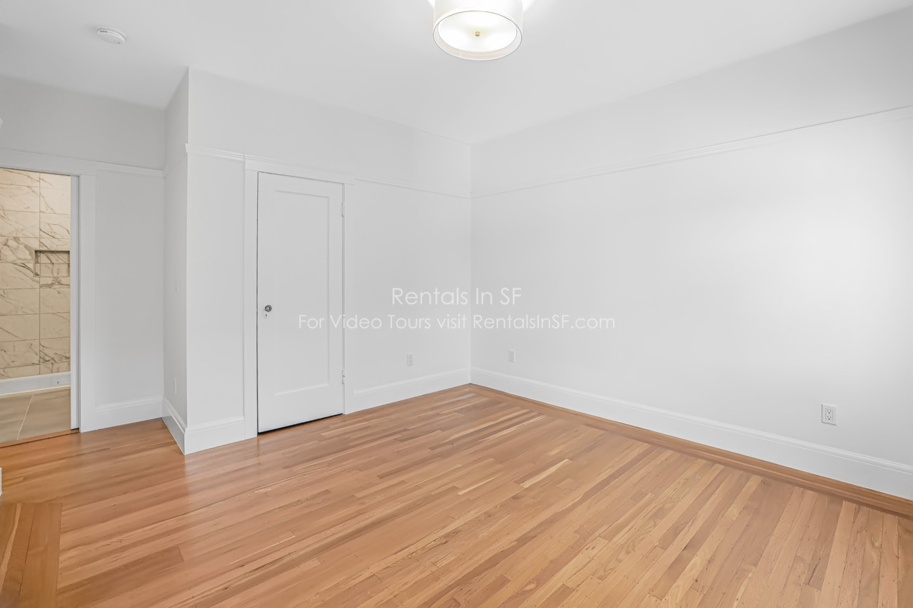 Full length 2 bedroom / 2 bathroom flat on a lovely, tree lined street in the Inner Richmond. This beautifully renovated unit features 2 spacious bedrooms, sunny living room, dining room and kitchen. The bedrooms are located in the back of the unit overlooking shared yard. Bedroom has en suite bathroom with walk in shower. The hallway bathroom has shower over tub combination. The modern kitchen has stainless steel refrigerator, dishwasher, gas oven range and quartz countertops. Great closet space in both bedrooms and large walk in hall closet. Shared laundry in the building.