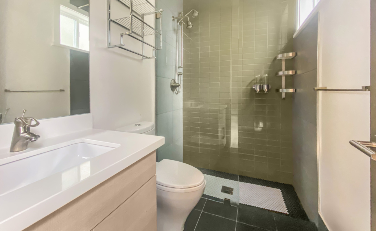 – Modern bathroom with large shower stall (no tub), vanity and tile flooring