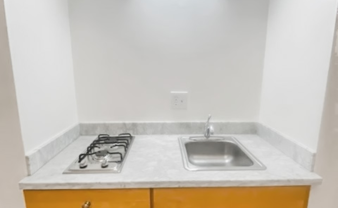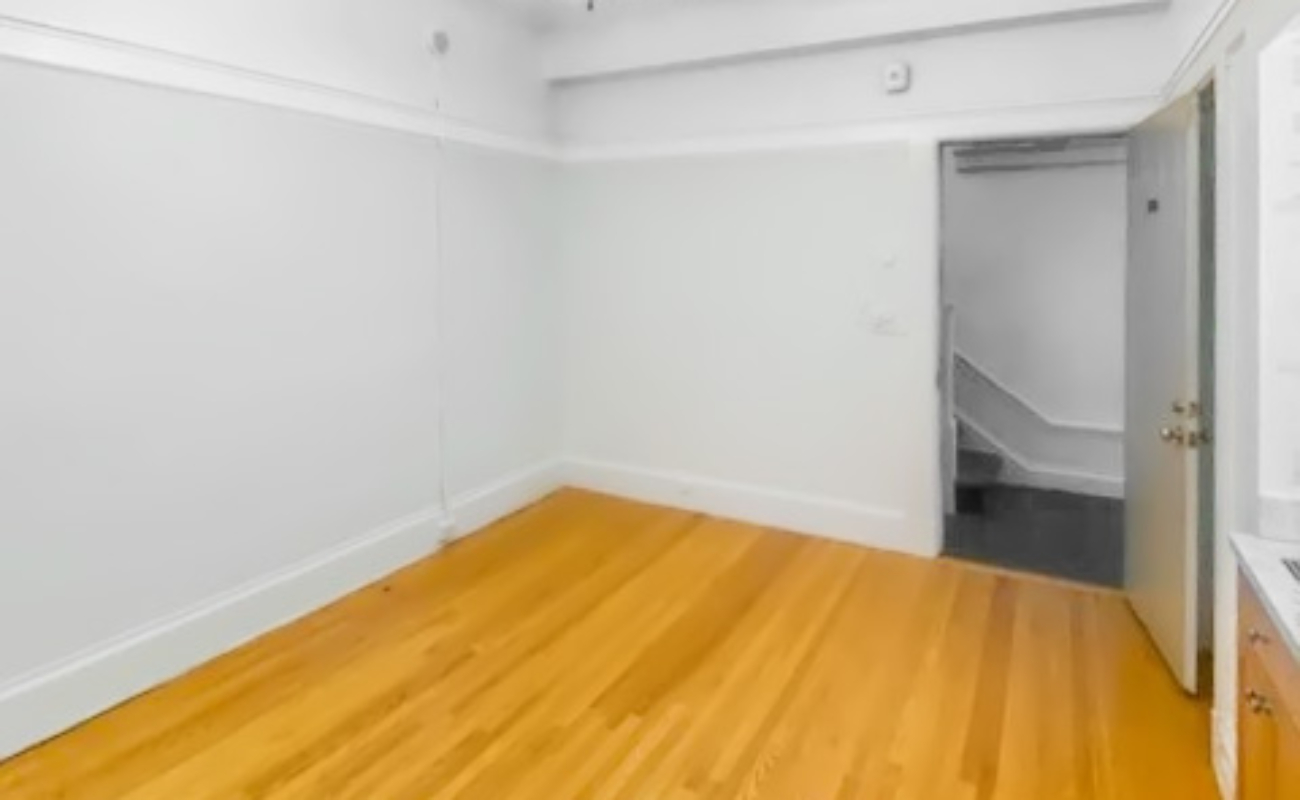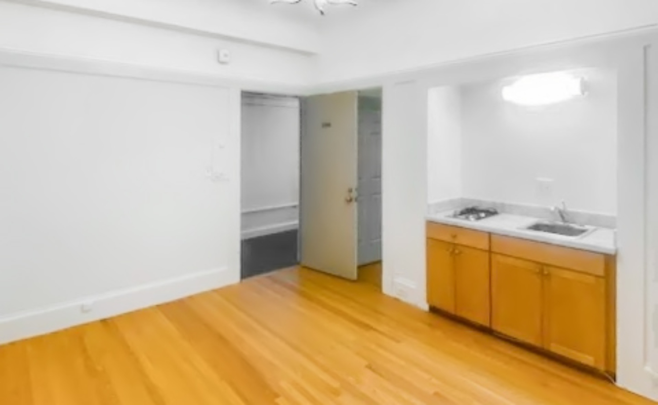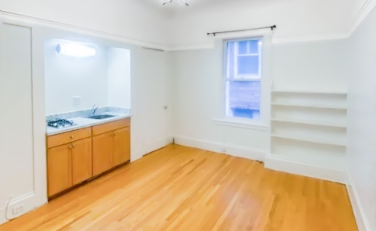 This is an efficiency studio apartment with a kitchenette (fridge, two burner gas cook top, marble counter and wood cabinets) and one full bath. Unit is small (will fit a full sized bed best) but has classic Edwardian style. One big walk through closet. Hardwood floors. Corner unit!
