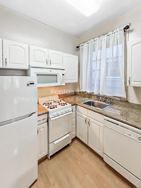 This one bedroom apartment has updated kitchen and bath. Open concept floor plan – living room is open to the kitchen with French doors to the bedroom. The kitchen features granite counters, lots of cabinet space, and all appliances (fridge, gas range, microwave, dishwasher & disposal). 3/4 bathroom (shower only). Hardwood floors throughout.